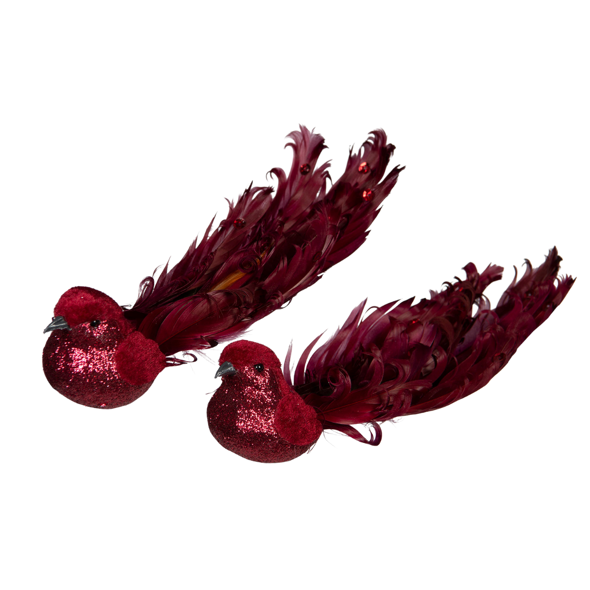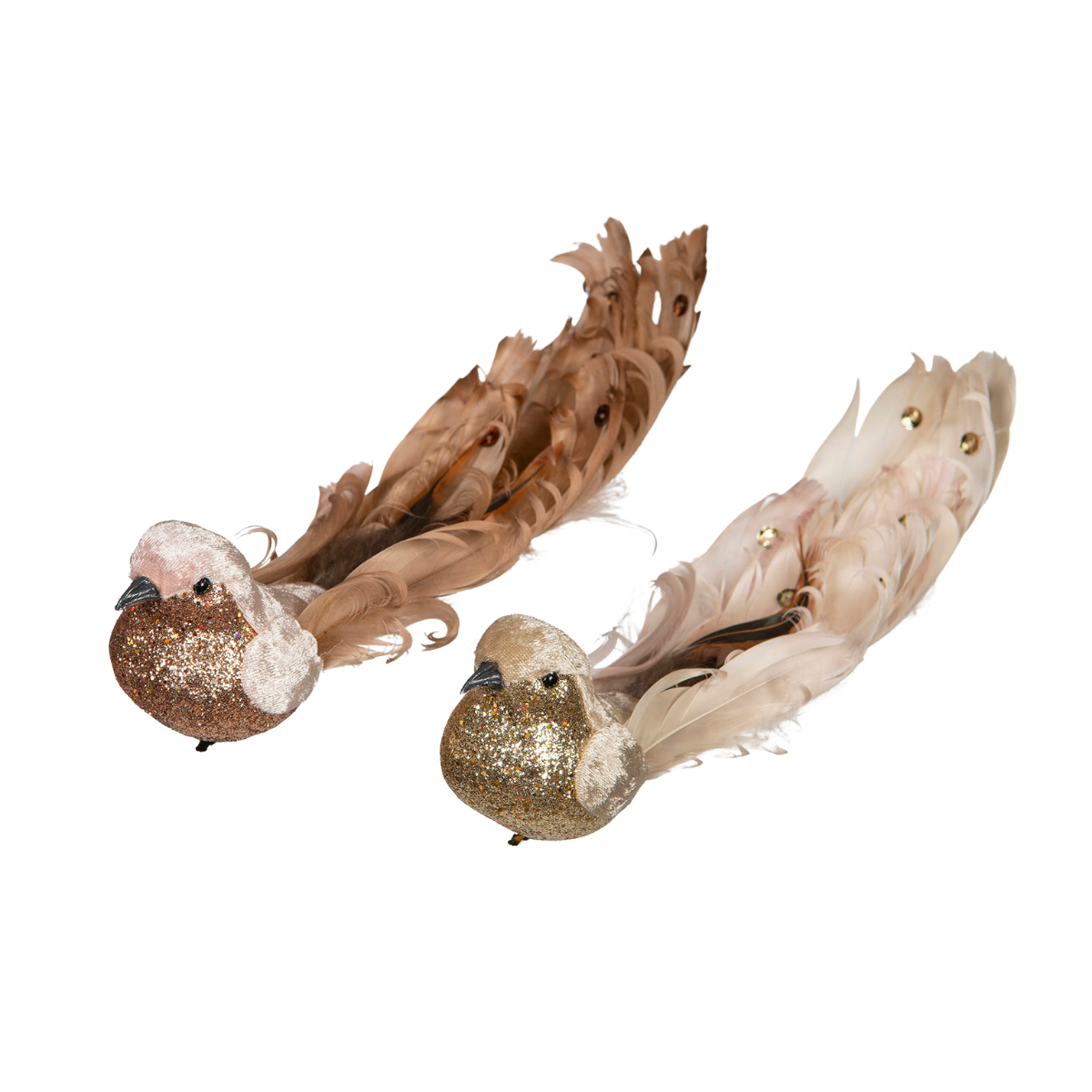 Vackra dekorationsfåglar med sammetsdetaljer, glitter och äkta fjädrar som ger ett lyxigt utseende. Tack vare metallclipset kan du enkelt fästa dem i granen, på en girlang eller i andra arrangemang. Finns i flera färger.