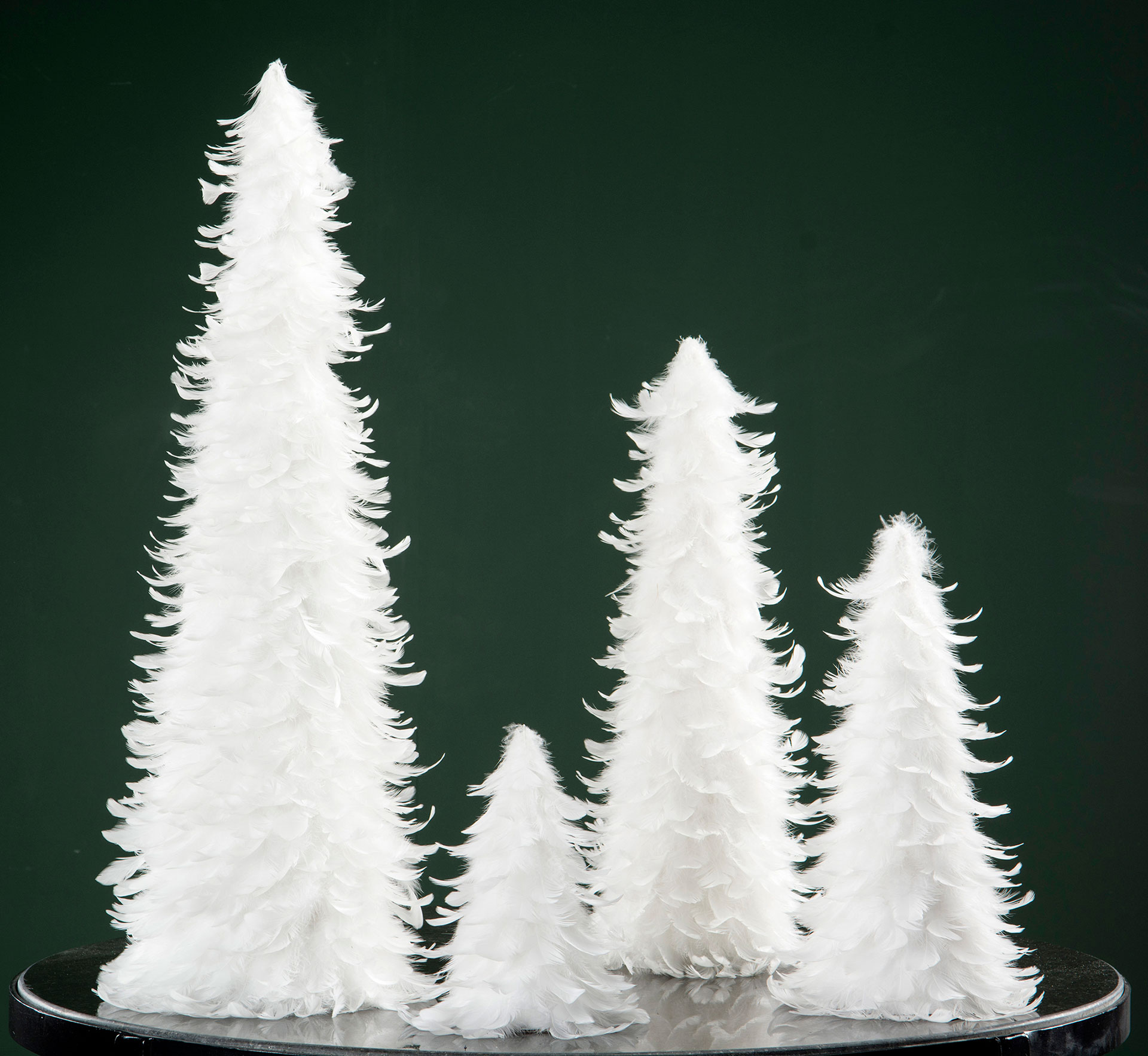En unik julgran gjord av fjädrar som skapar en mjuk och dekorativ känsla. Passar bra på sidobord, i fönster eller som del av ett större jularrangemang. Finns i flera färger och storlekar.