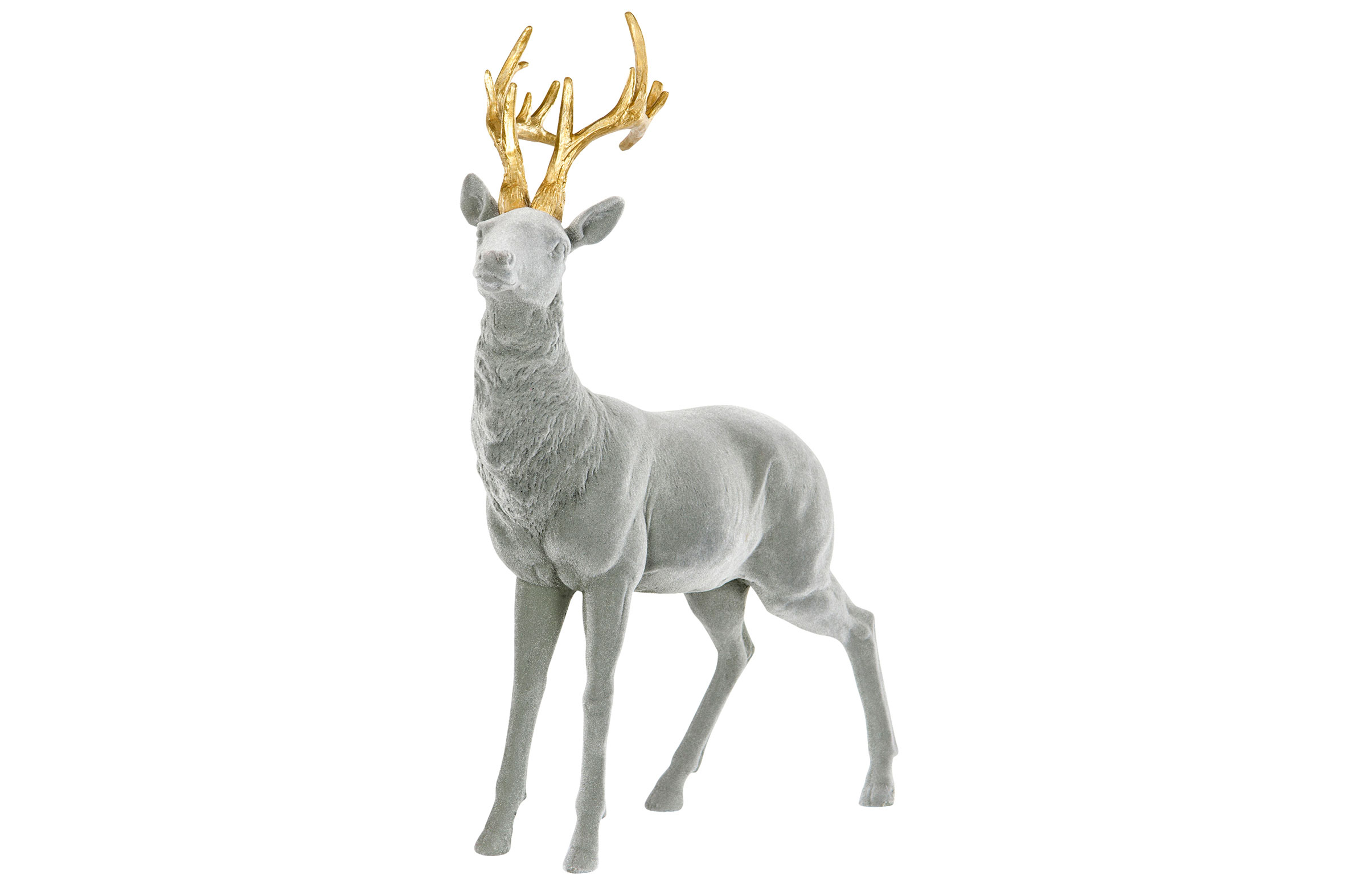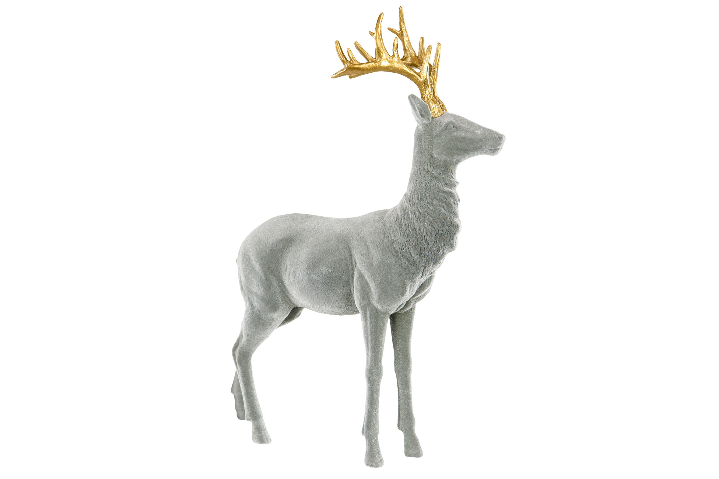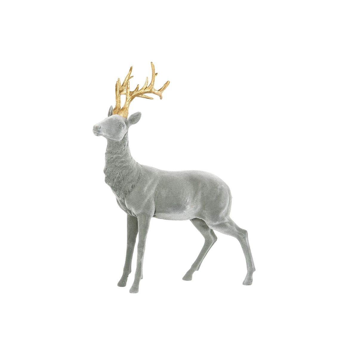 En elegant hjort med mjuk sammetsyta och glänsande guldfärgade horn. En dekorativ detalj som ger hemmet en exklusiv känsla. Tillverkad av poly.
