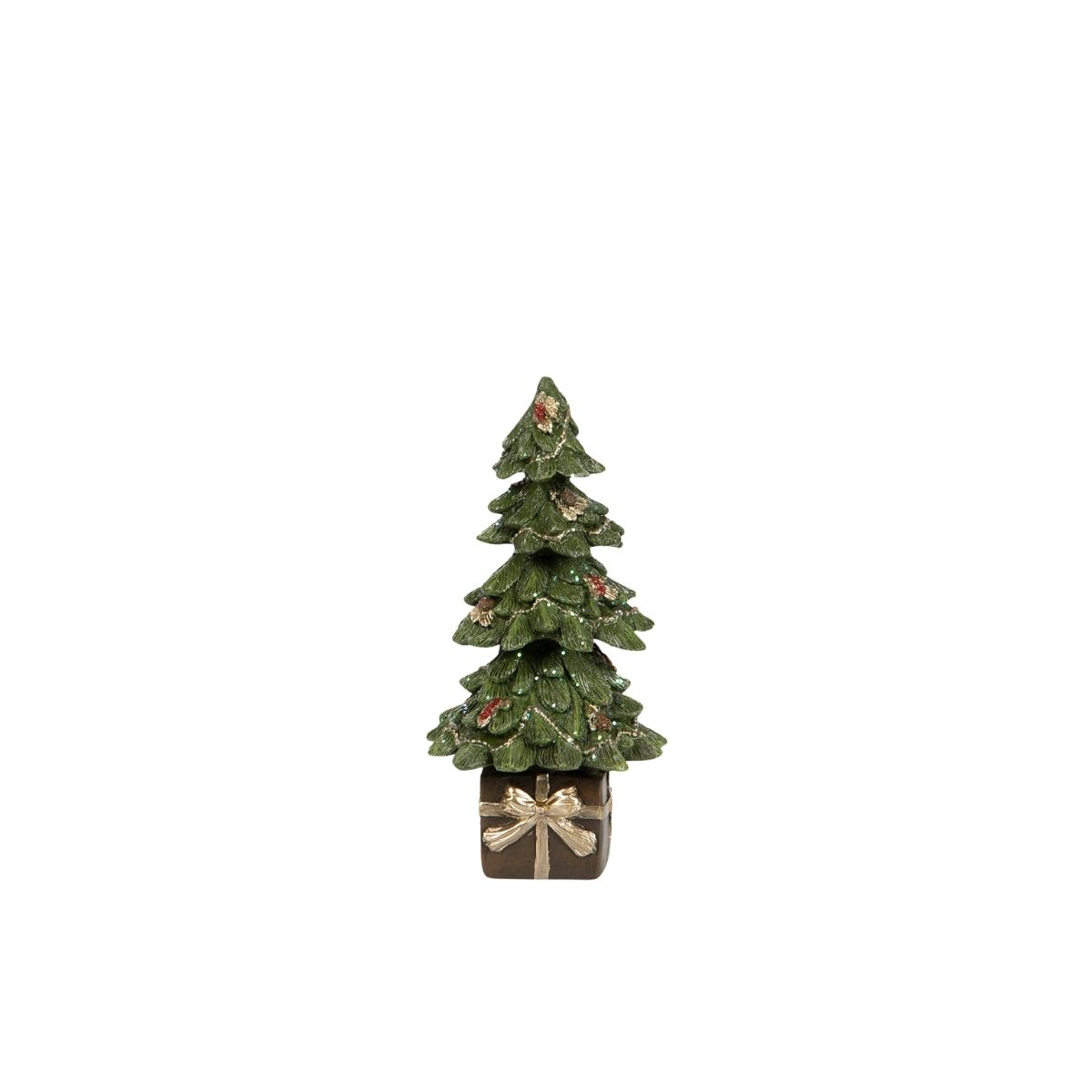 En klassisk juldekoration med en gran och en julklapp vid foten. En enkel och fin detalj att ha på bord, hylla eller i julgrupper. Tillverkad av poly.