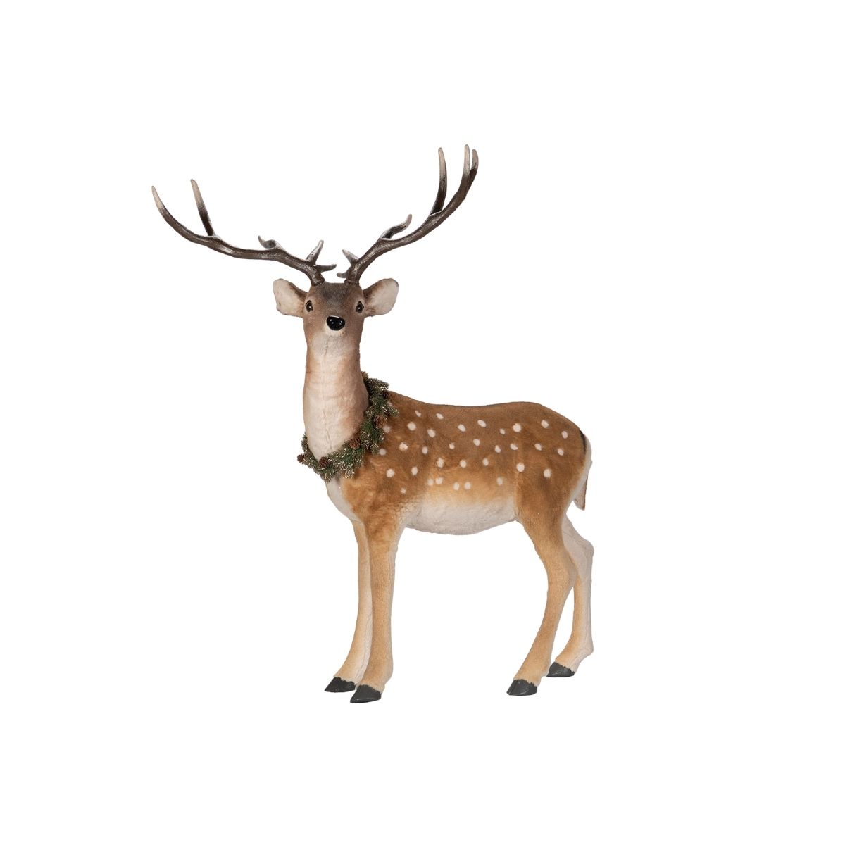 Denna dovhjort är en perfekt dekoration som tar in naturens skönhet i hemmet. Med textila detaljer och naturtrogen form blir den ett fint blickfång i entrén, vardagsrummet eller som del av jul inredningen. Tillverkad av frigolit och textil.