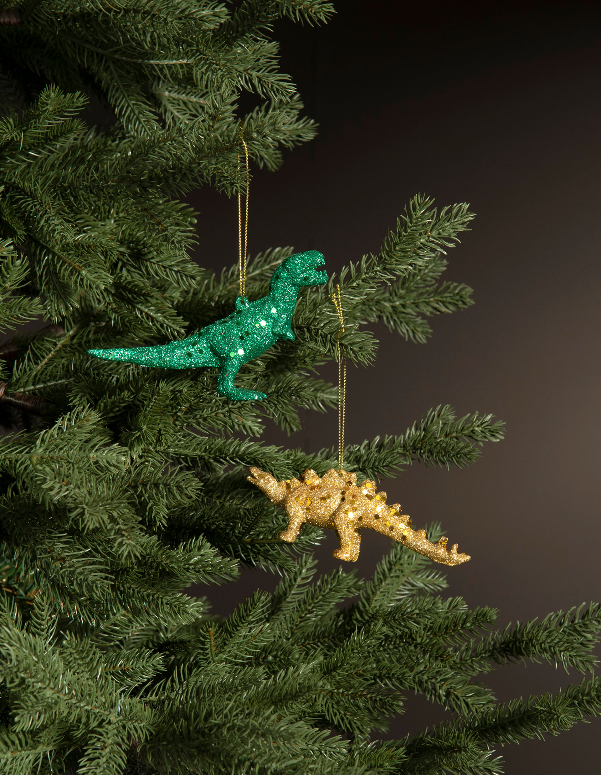 Klä julgranen eller dekorera blomsterarrangemanget med ett set med glittriga hängande dekorationer som ser ut som dinosaurier.