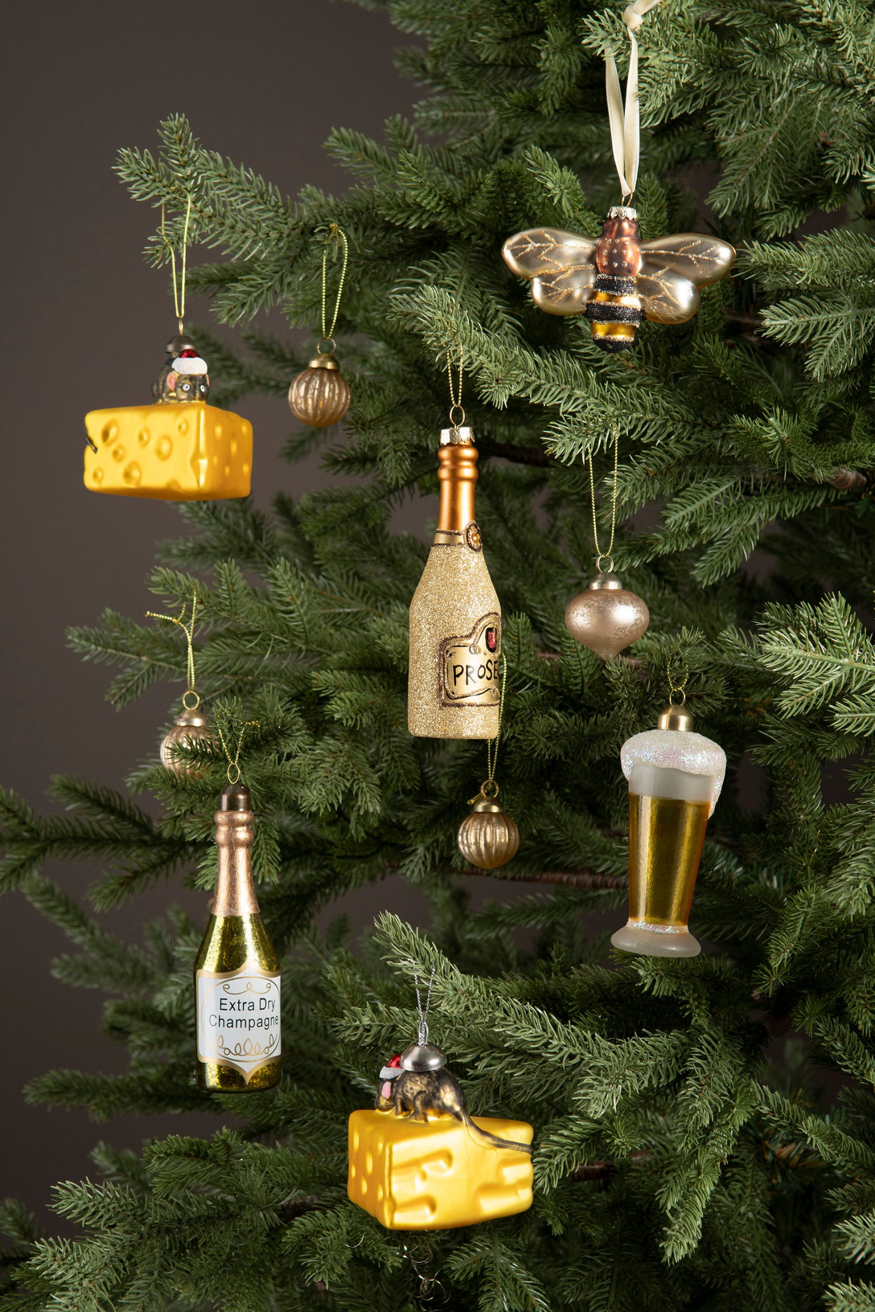 Julgranen får en lekfull touch med en hängande dekoration som ser ut som ett ölglas.
