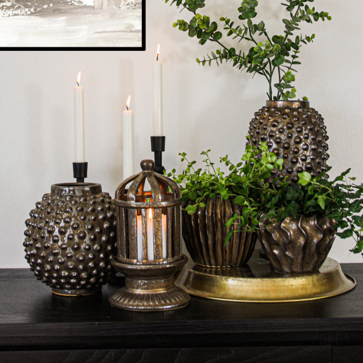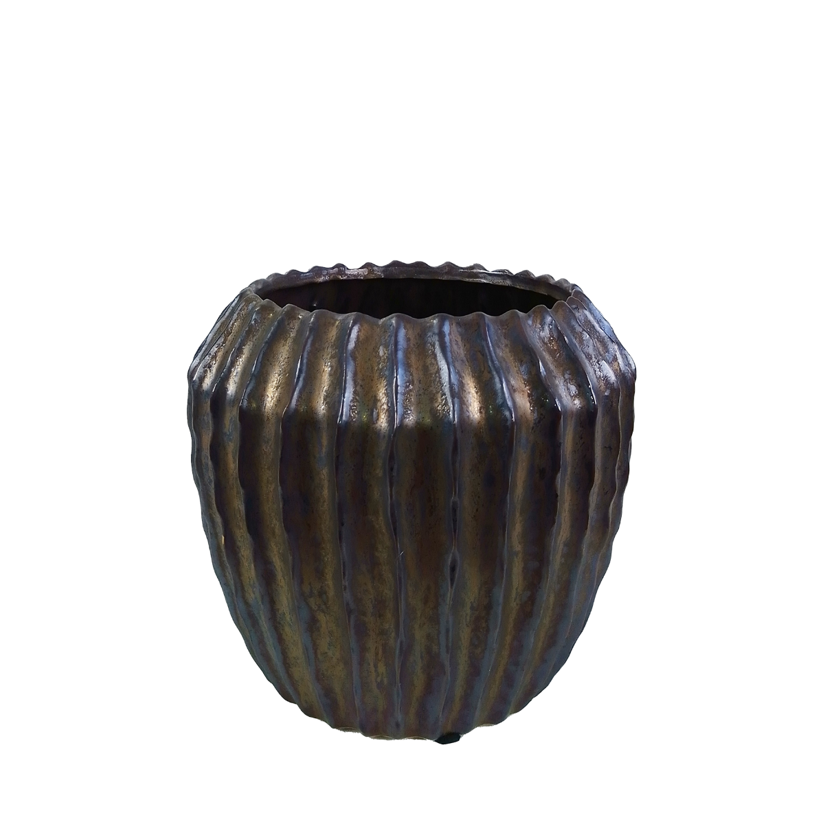 Ge hemmet en lyxig detalj med denna kruka i bronsfinish och dekorativt räfflad yta. Tack vare den enkla men eleganta designen passar den in i både modern och klassisk inredning. Krukan kan placeras ensam som en stilren detalj eller kombineras med de andra storlekarna i serien för ett enhetligt intryck.