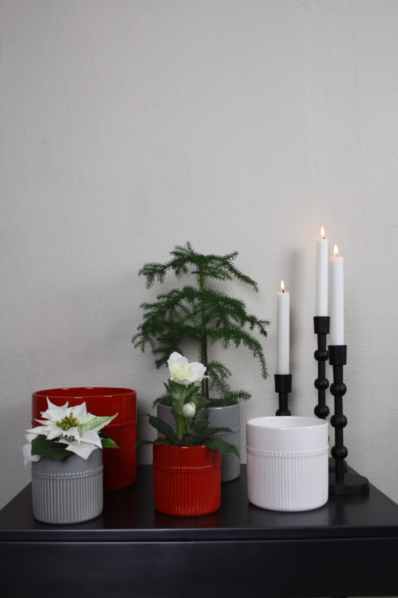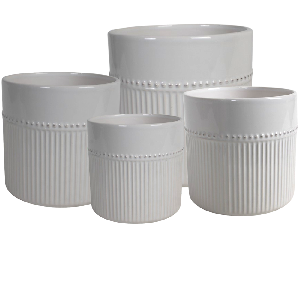 Fyra dekorativa krukor i keramik med räfflad struktur och en diskret pärlrad upptill som ger en elegant känsla. Den tidlösa designen gör att krukorna passar i många olika inredningsstilar, från klassiskt till modernt. Med storlek 17×16 cm är de lagom för både blommor och gröna växter. Setet kan gärna kombineras med andra färger eller användas tillsammans för ett enhetligt uttryck. Finns i vit, röd, grå och grön.