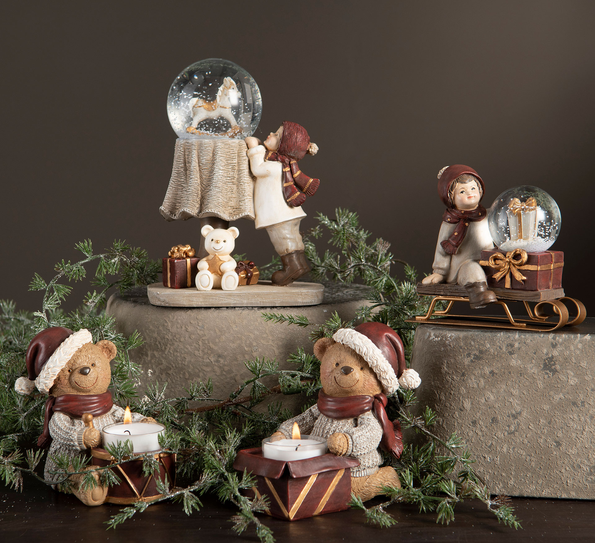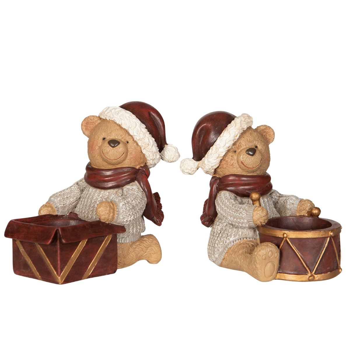 Söta nallebjörnar som håller varsin värmeljushållare. Perfekt för att skapa mysig julstämning på bord eller fönsterbräda. Tillverkade i poly.