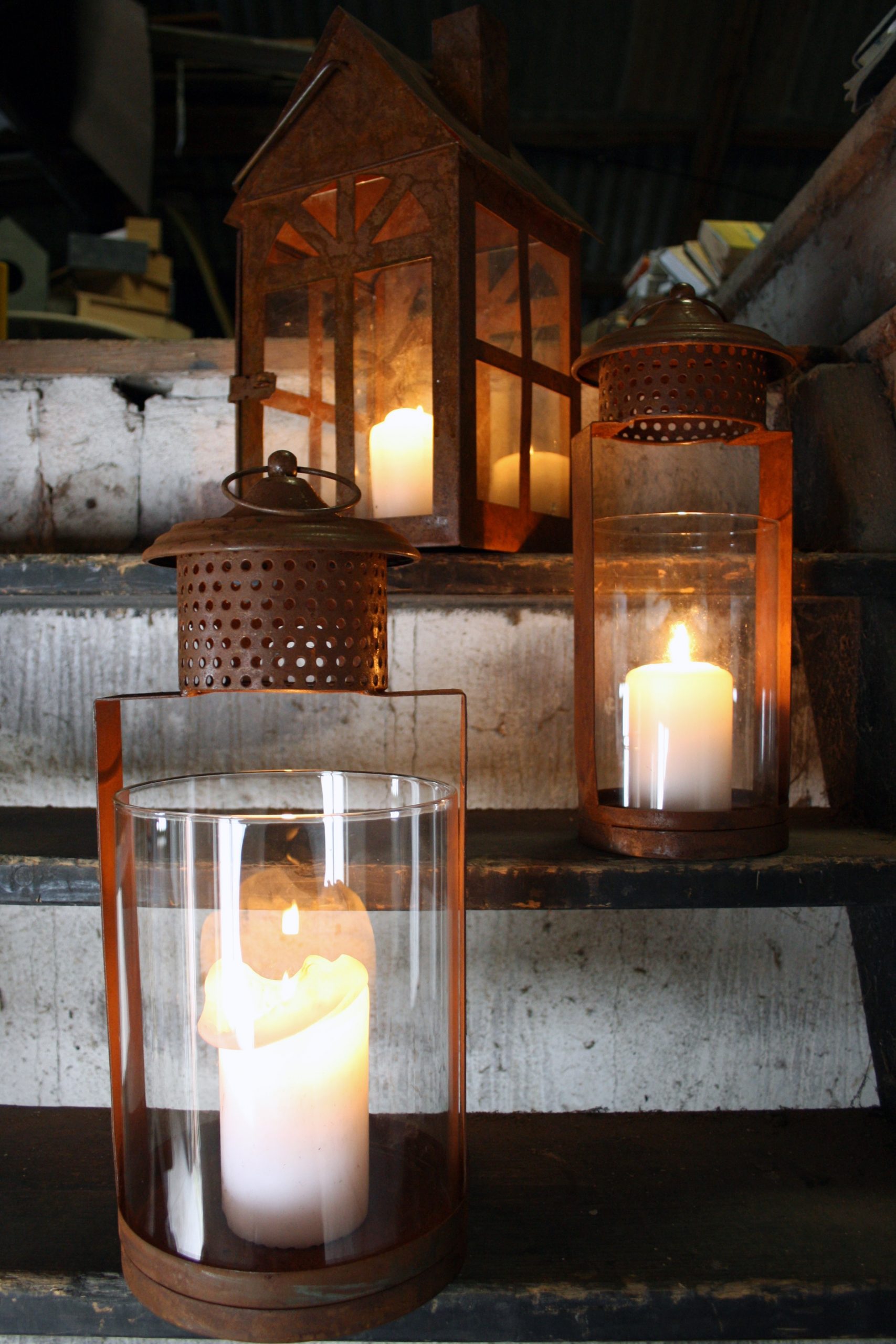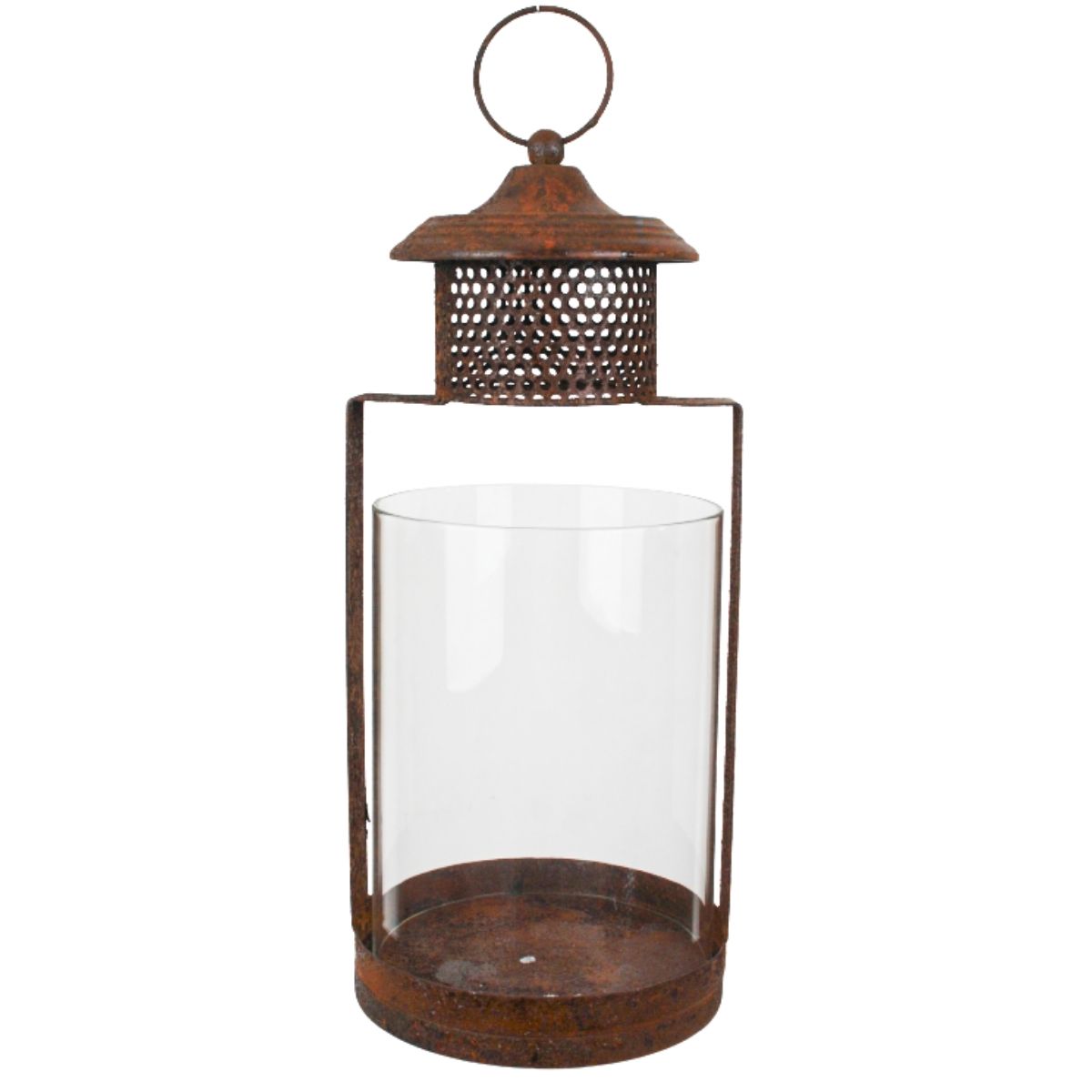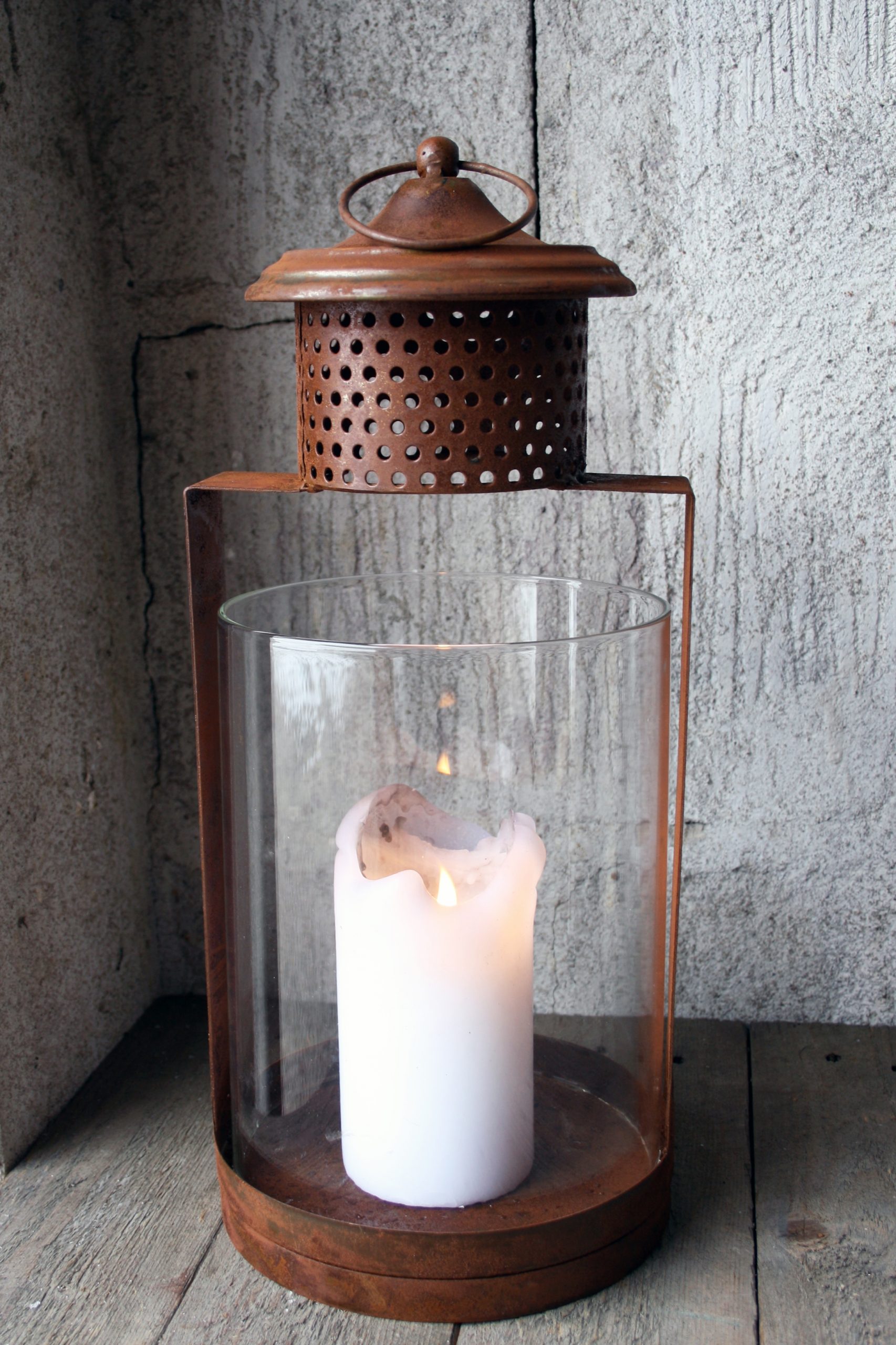 Denna stora lykta i rostfinish kombinerar robust design med elegant stil. Utrustad med stormglas som skyddar lågan, passar den utmärkt både inomhus och utomhus. Med måtten 18×43 cm blir den en iögonfallande detalj på bord, uteplats eller entré. Låt lyktan lysa ensam eller tillsammans med andra lyktor för en mysig stämning.