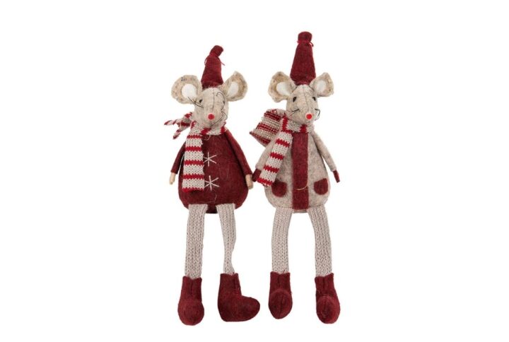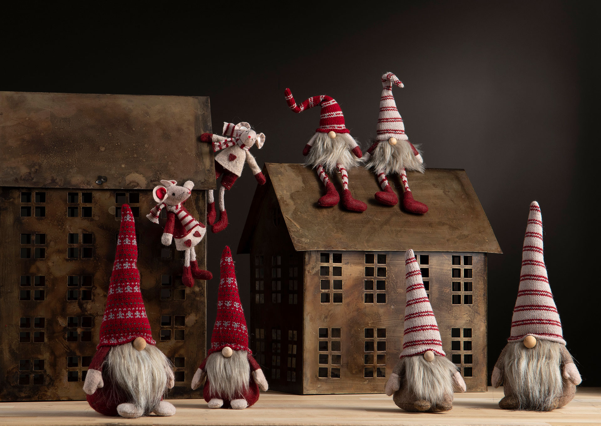 En stickad röd jultomte i textil, 25 cm hög, som sitter ner. Perfekt att placera på en hylla, låda eller annan kant för en lekfull och stämningsfull juldekoration.