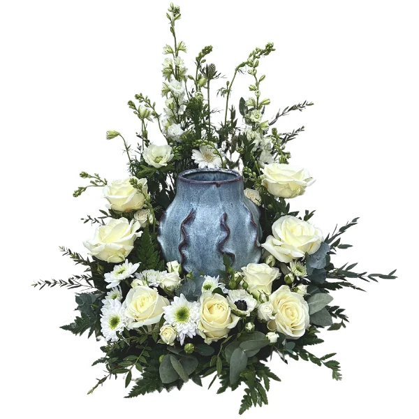 En urndekoration är en vacker och stilfull blomsterarrangemang som ramas in kring urnan vid ceremonin. Den bidrar med en känsla av värdighet, kärlek och stillhet, en sista hälsning till en älskad. Ni väljer önskad färgton, och våra florister skapar därefter en harmonisk och personlig dekoration med säsongens blommor i matchande nyanser.